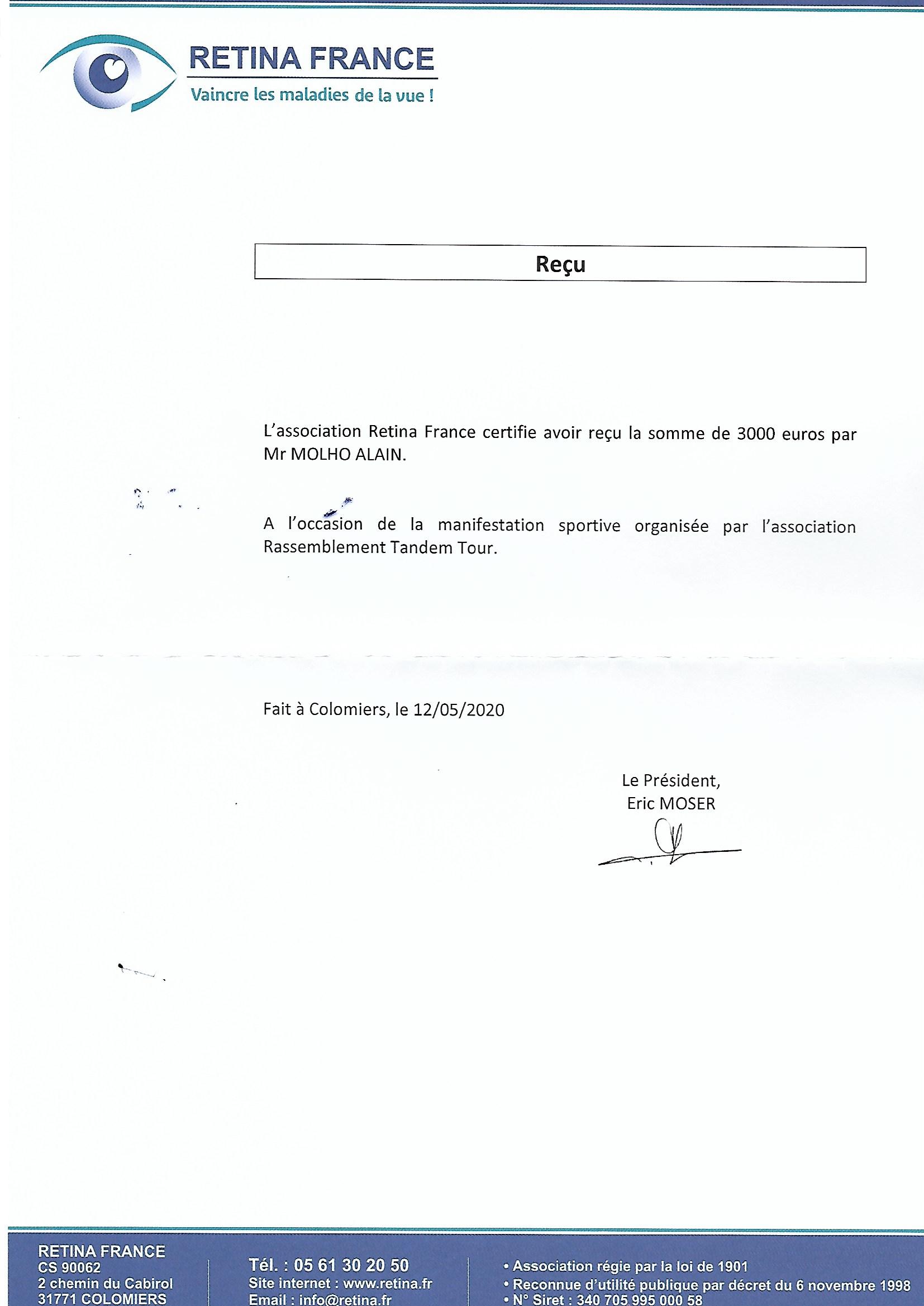 Don 2019 à Retina France Posted on 18 mai 2020 by Alain Molho Archives Nous venons de recevoir les remerciements de M. Moser Président de Retina France